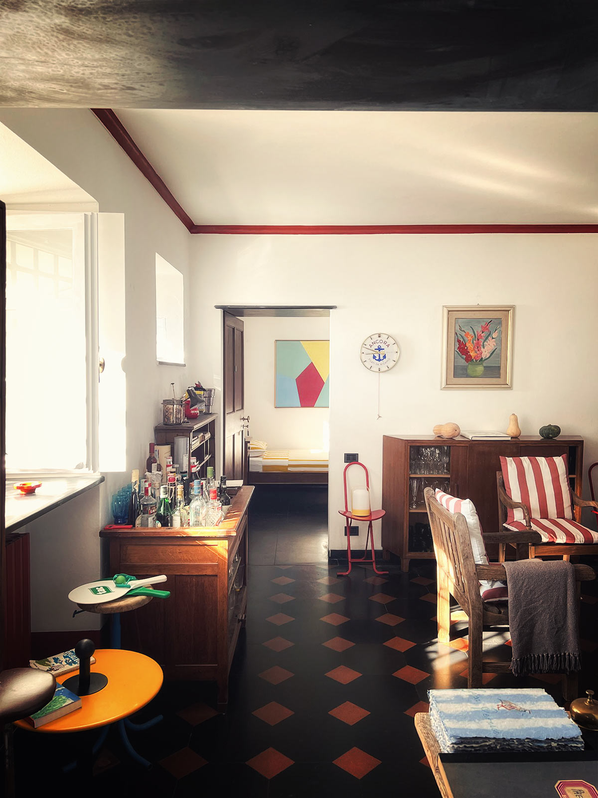 Das Ambiente erinnert eher an das Innere eines Bootes. Die anderen Zimmer sind ebenfalls Schmuckstücke. Im Bad: Armaturen aus der Kollektion Gio Ponti von Mamoli. Im hinteren Teil des Gartens gelangt man in das rote Zimmer, das „lato sestri“ genannt wird. Auch hier ist die Aussicht zauberhaft, mit einer kleinen Terrasse, auf der man frühstücken kann.