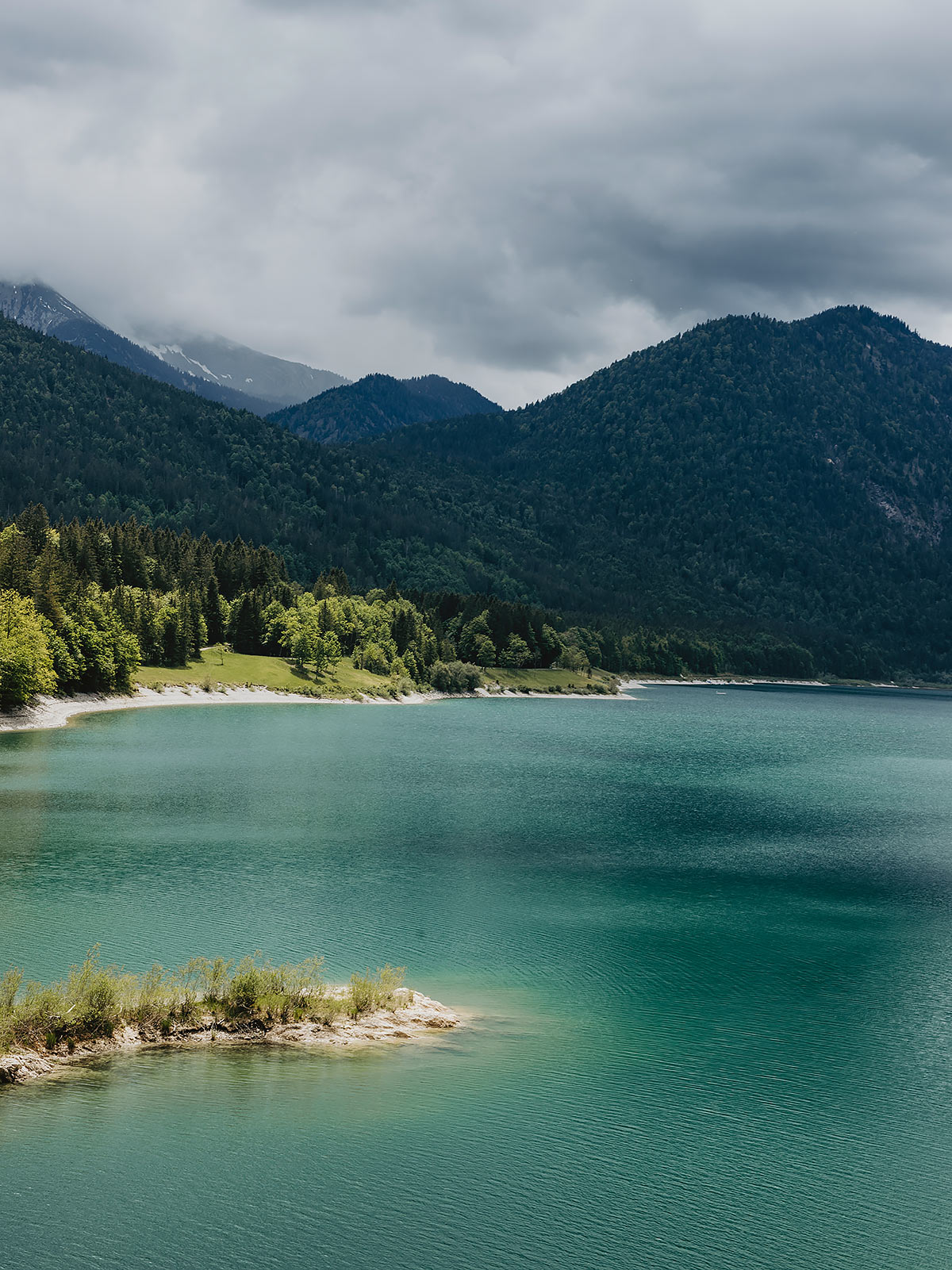 Die Fahrt von Lermoos an den Tegernsee muss man einfach lieben. Denn sie führt durch eines der schönsten Naturschutzgebiete Bayerns. Man fährt via Garmisch Richtung Krün und Wallgau, biegt dann an den grün schimmernden Walchensee ab und lässt das leise E-Auto durch die Mautstraße in die Jachenau gleiten. (Achtung: Nicht dem Navi und Google Maps folgen, die würden das Auto direkt über den Sylvensteinspeicher schicken. Der ist ebenfalls schön, aber nicht so malerisch wie der Walchensee). Wer möchte, fährt von Lenggries via Kreuth und Rottach-Egern nach Gmund, das ist ein kleiner Umweg, lohnt sich aber.