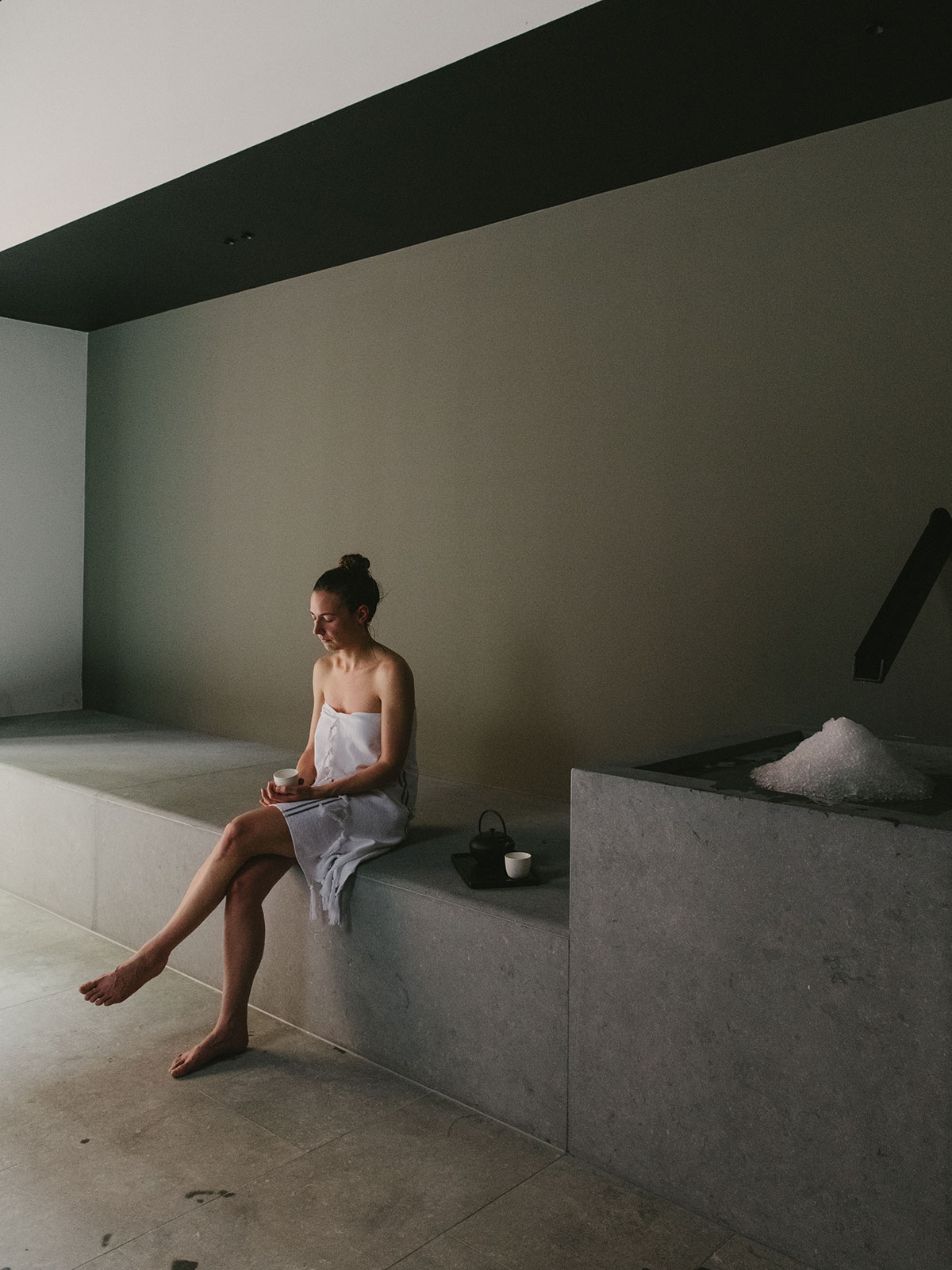 Der kleine feine Spa-Bereich mit Sauna, Hamam und sogar einem kleinen Naturpool im Garten ist ebenfalls in klarem Design gehalten und kann ausschließlich privat gebucht werden. Wir empfehlen Verfügbarkeiten und Preise vorab zu klären.